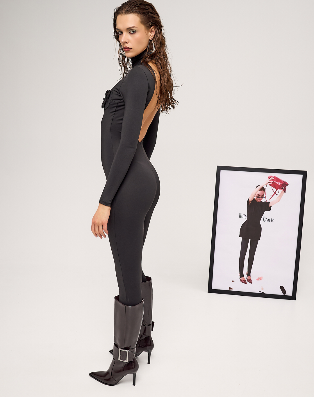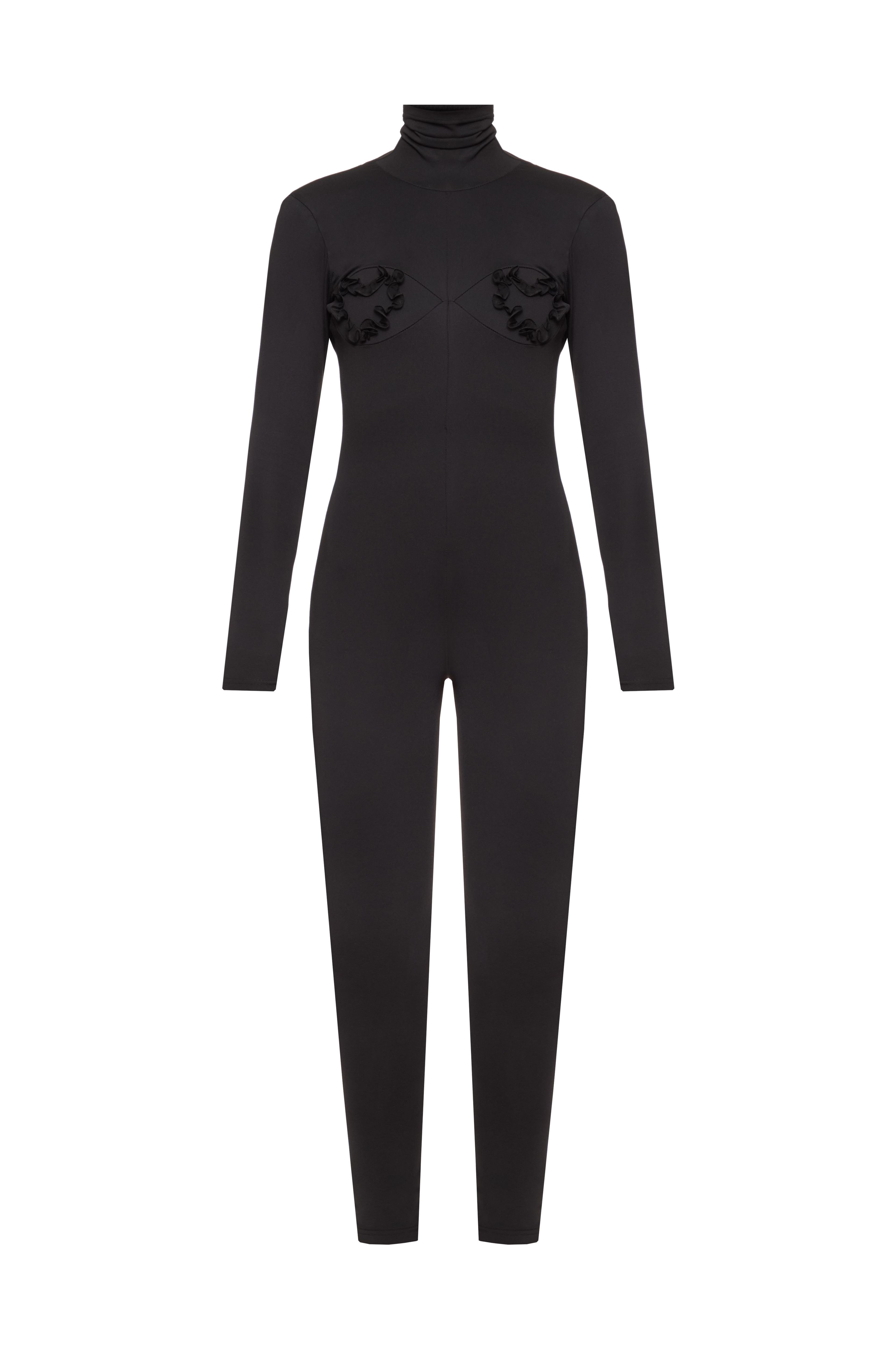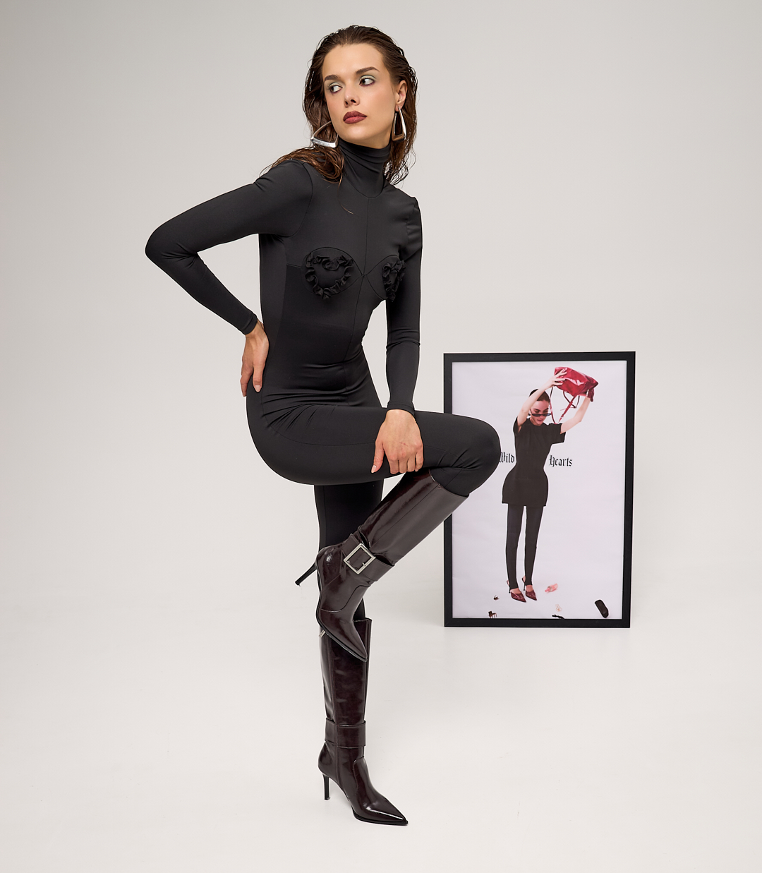 Облягаючий комбінезон з еластичного трикотажу з високою горловиною та довгими рукавами. На грудях - декоративні серця з м’яких рюшів, які створюють акцент у зоні декольте та додають силуету грайливості й чуттєвості.