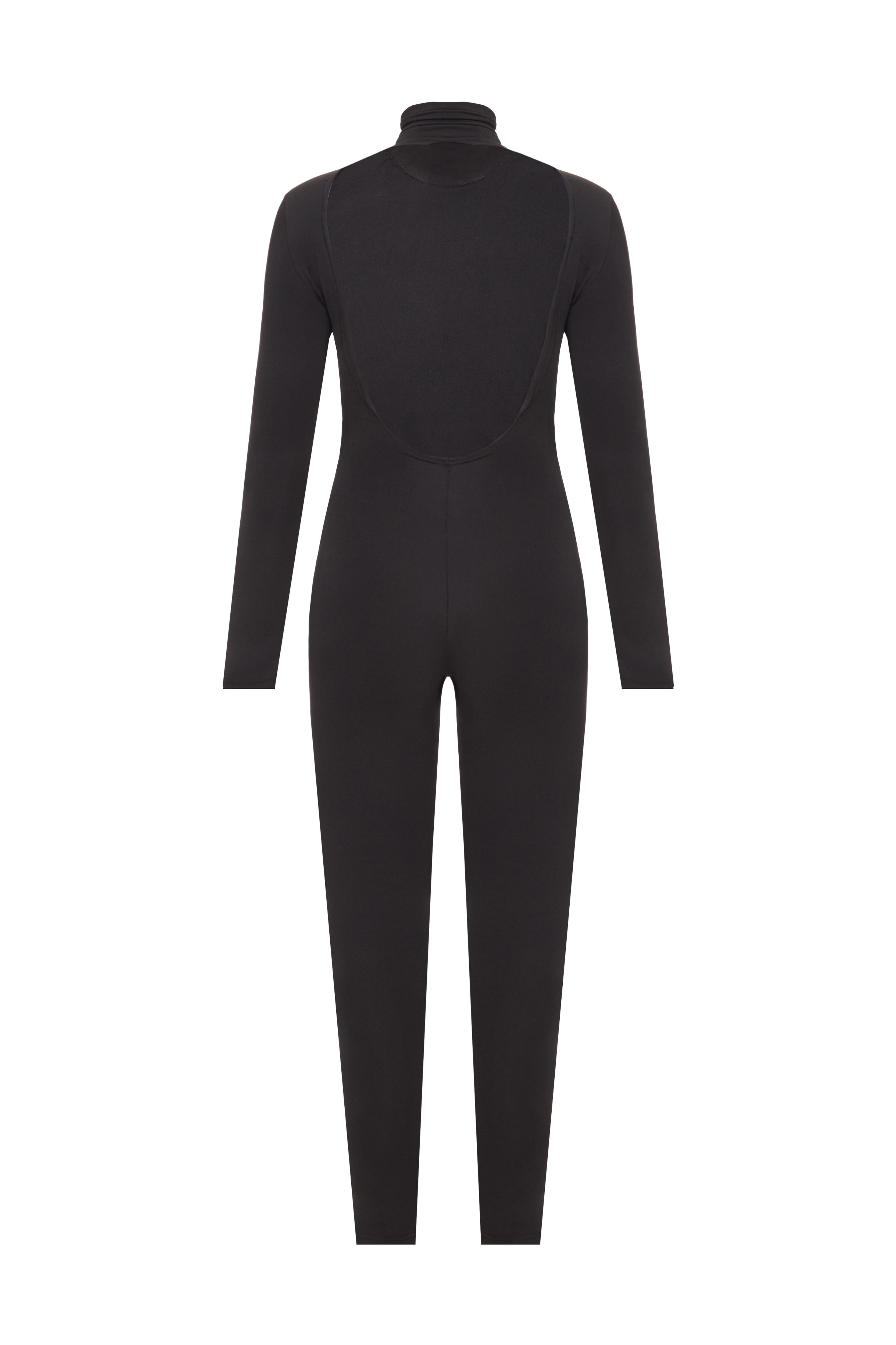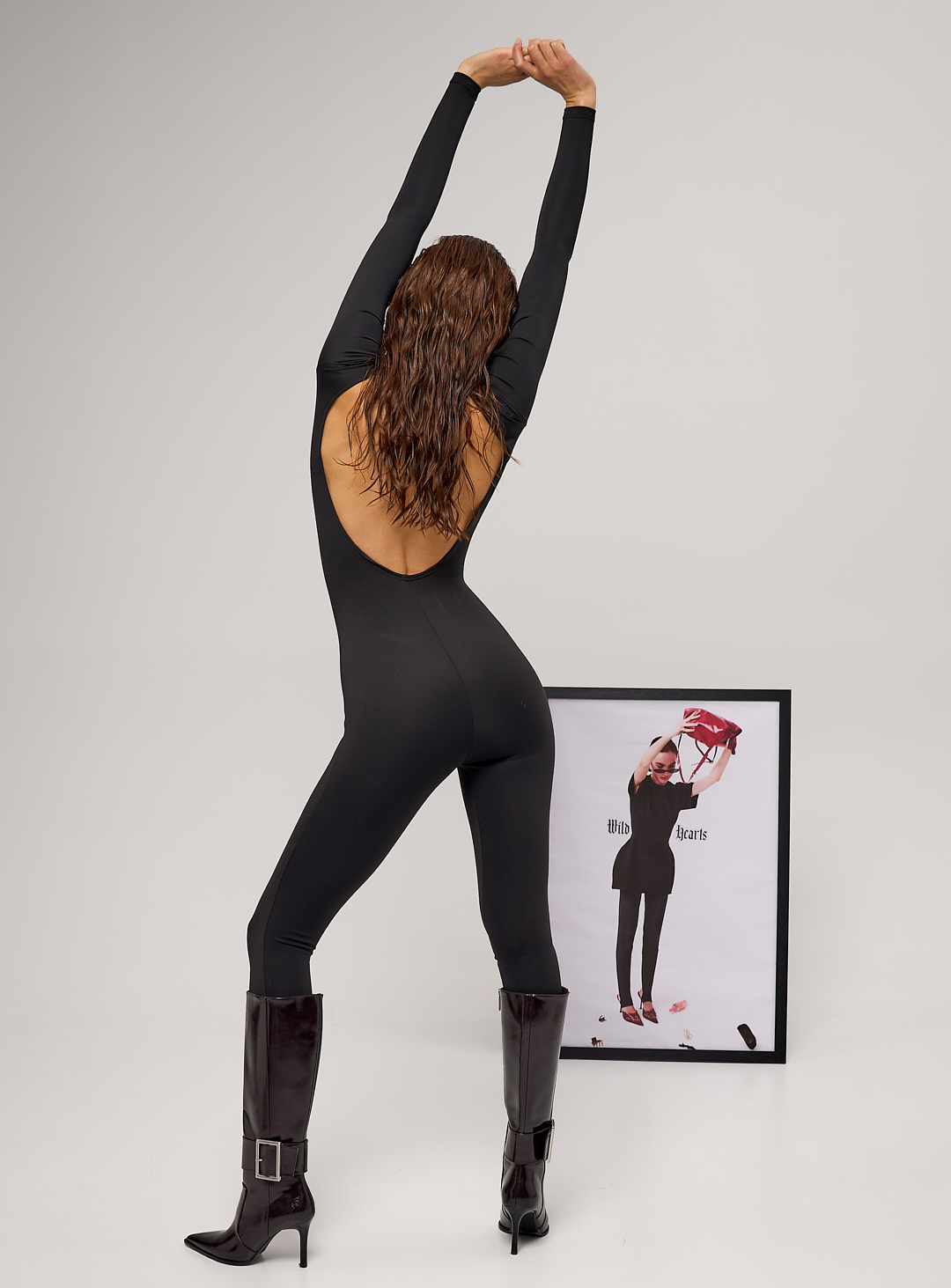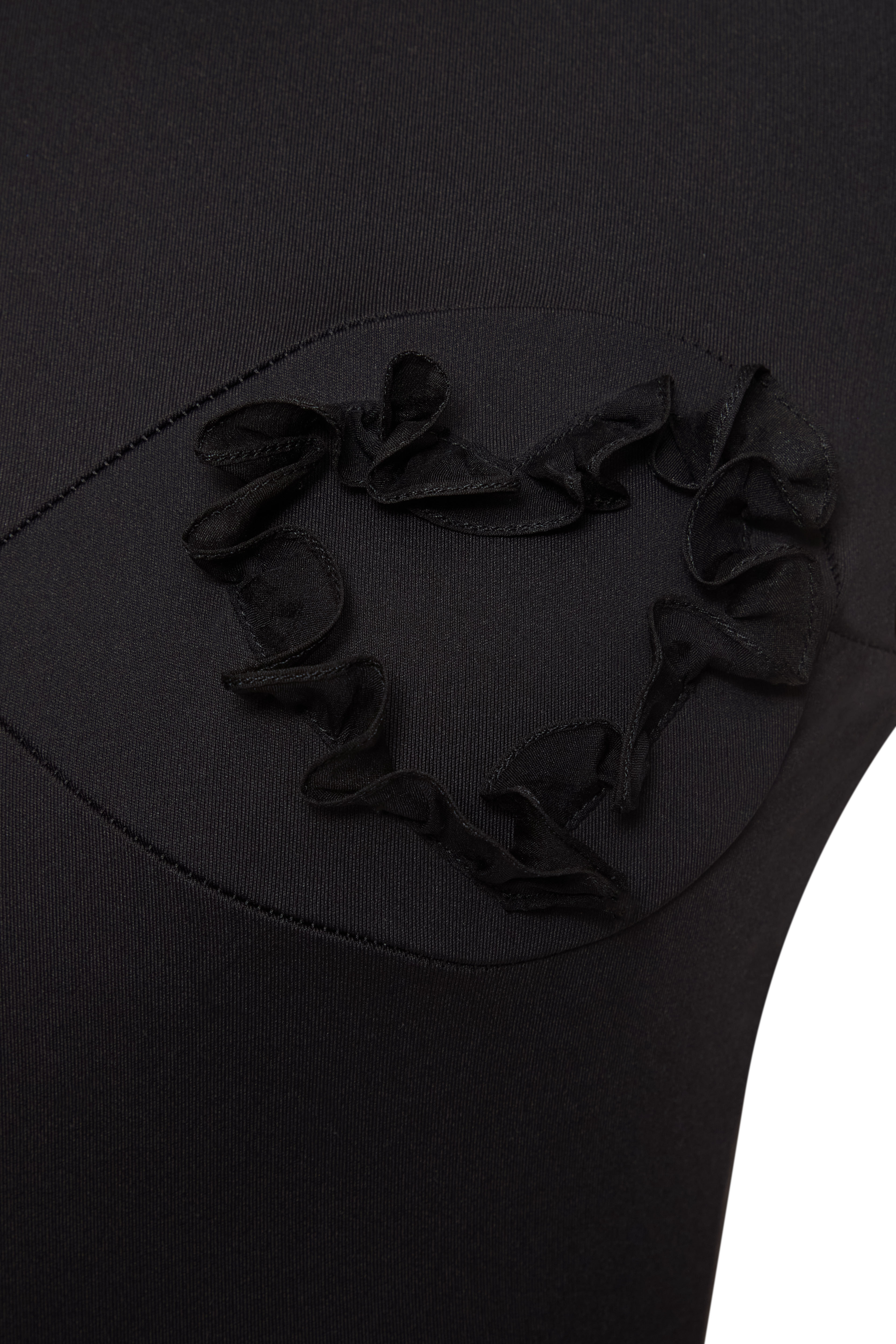 Облягаючий комбінезон з еластичного трикотажу з високою горловиною та довгими рукавами. На грудях - декоративні серця з м’яких рюшів, які створюють акцент у зоні декольте та додають силуету грайливості й чуттєвості.