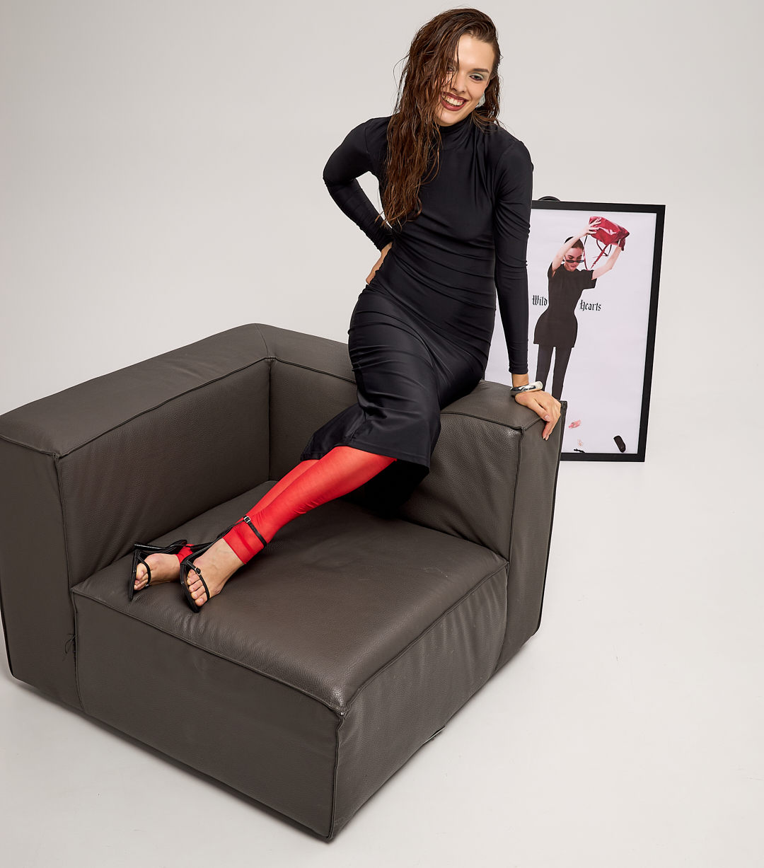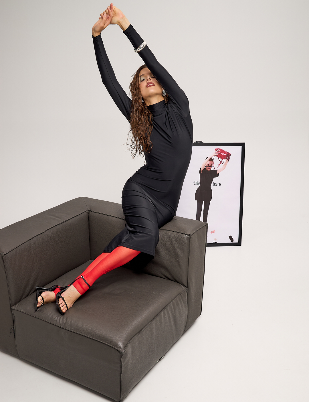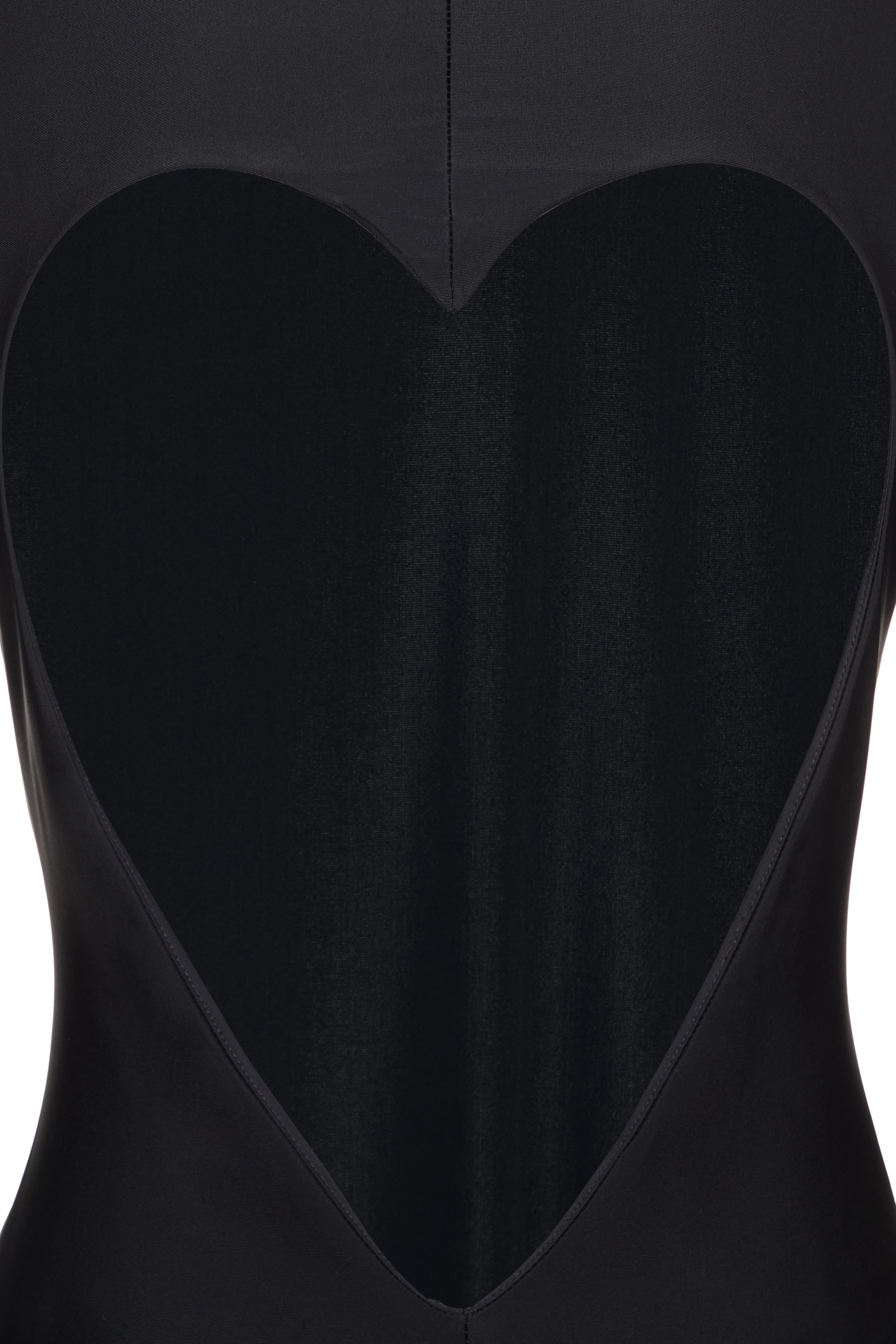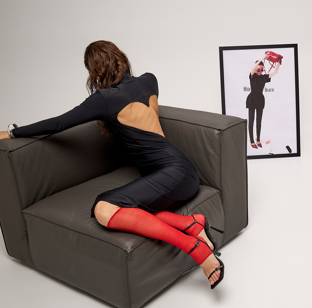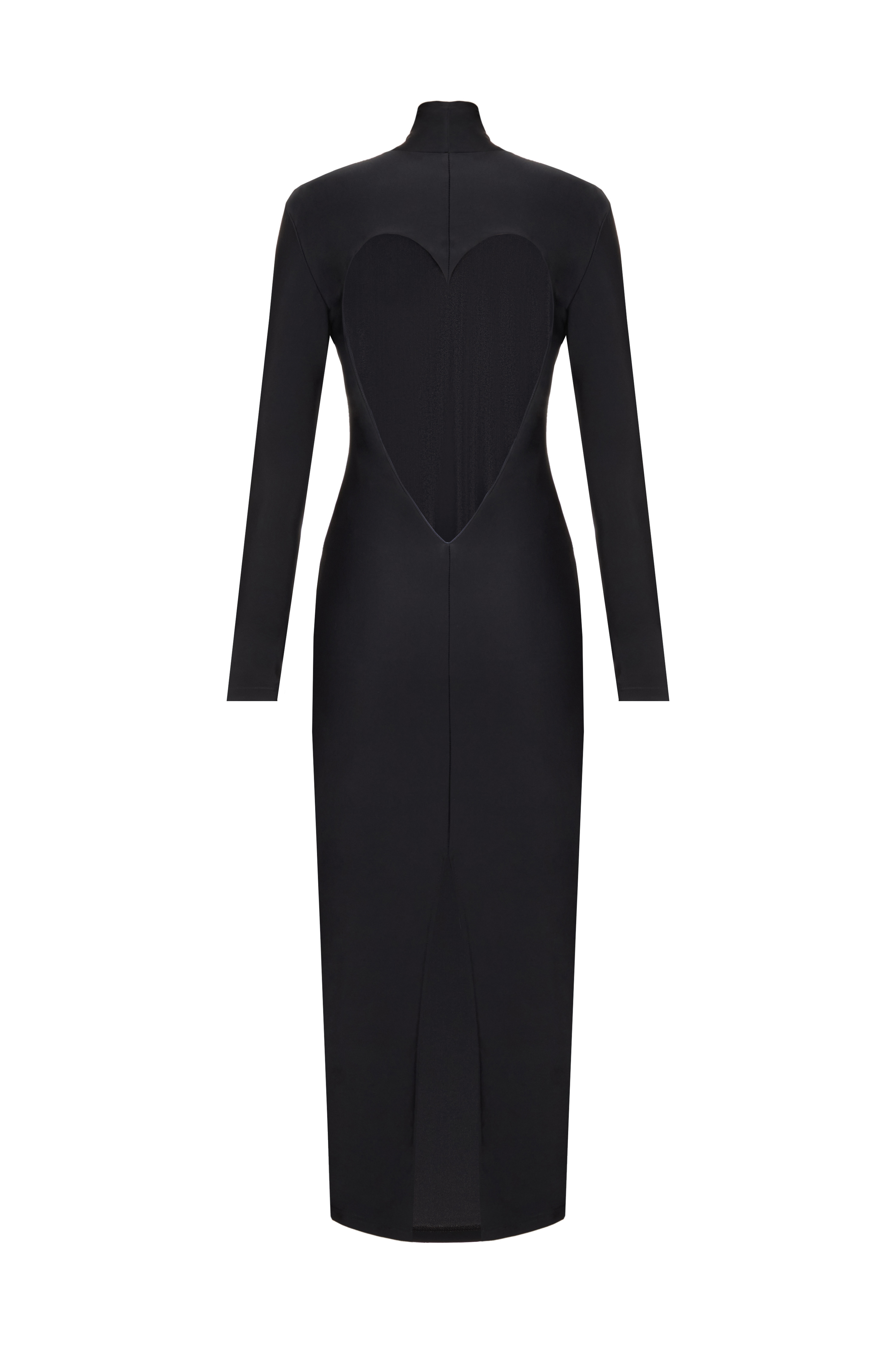 A fitted maxi dress in biflex with a high neck and long sleeves, creating a clean, minimalist silhouette in the front. The back features a deep sweetheart neckline in Wild Hearts' signature style, exposing the back and adding a dramatic sensuality to the look.